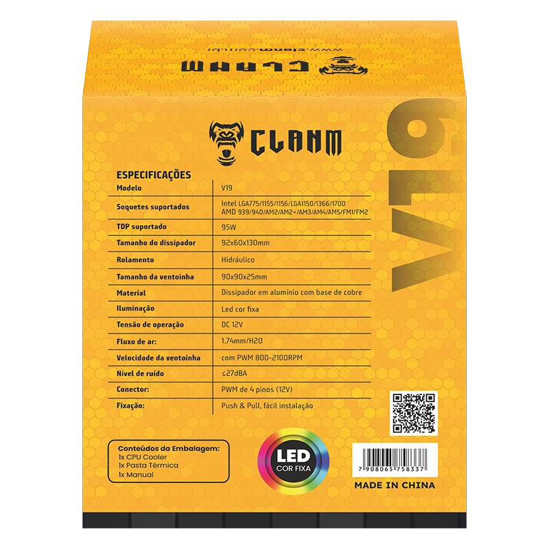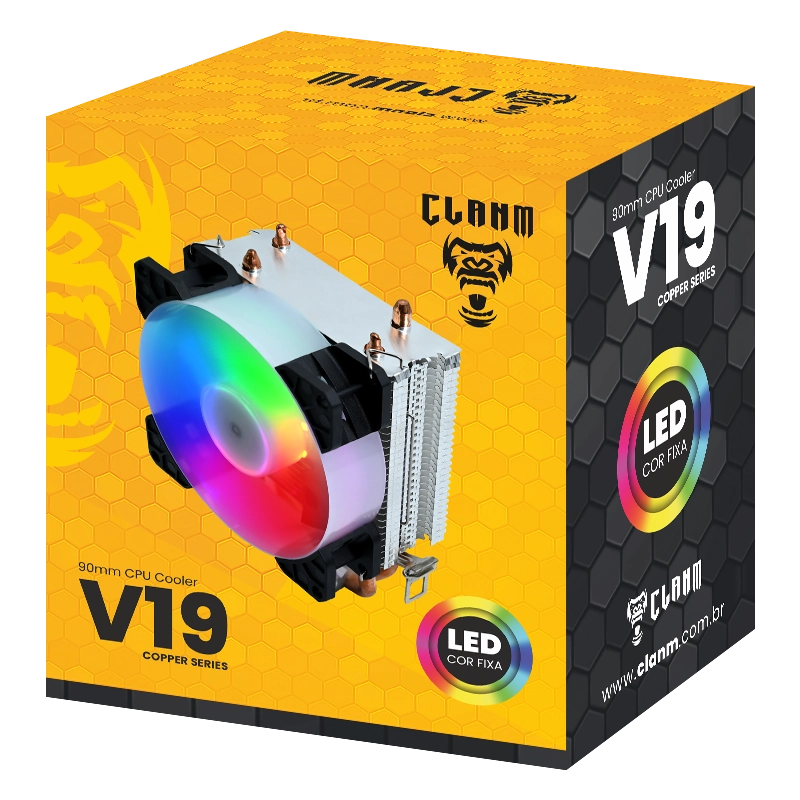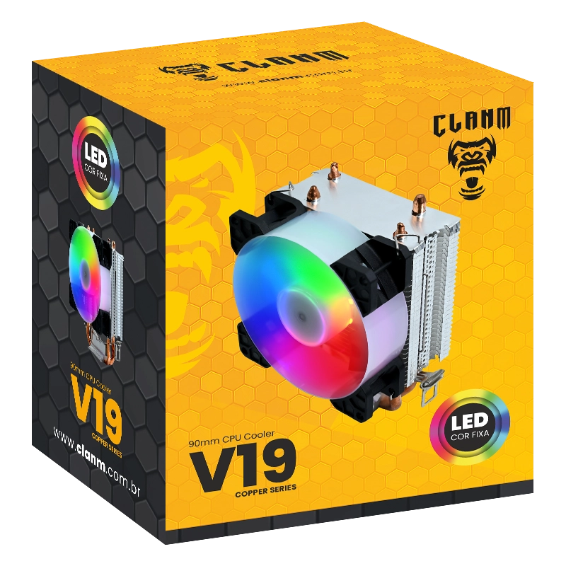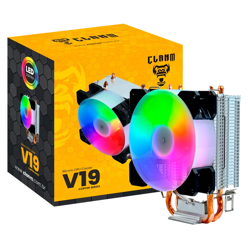 O cooler V19 da Clanm oferece excelente desempenho térmico para seu processador. Equipado com ventoinha ARGB e design moderno, garante refrigeração estável mesmo sob carga. Ideal para gamers e usuários exigentes que buscam eficiência, visual impactante e operação silenciosa no setup.